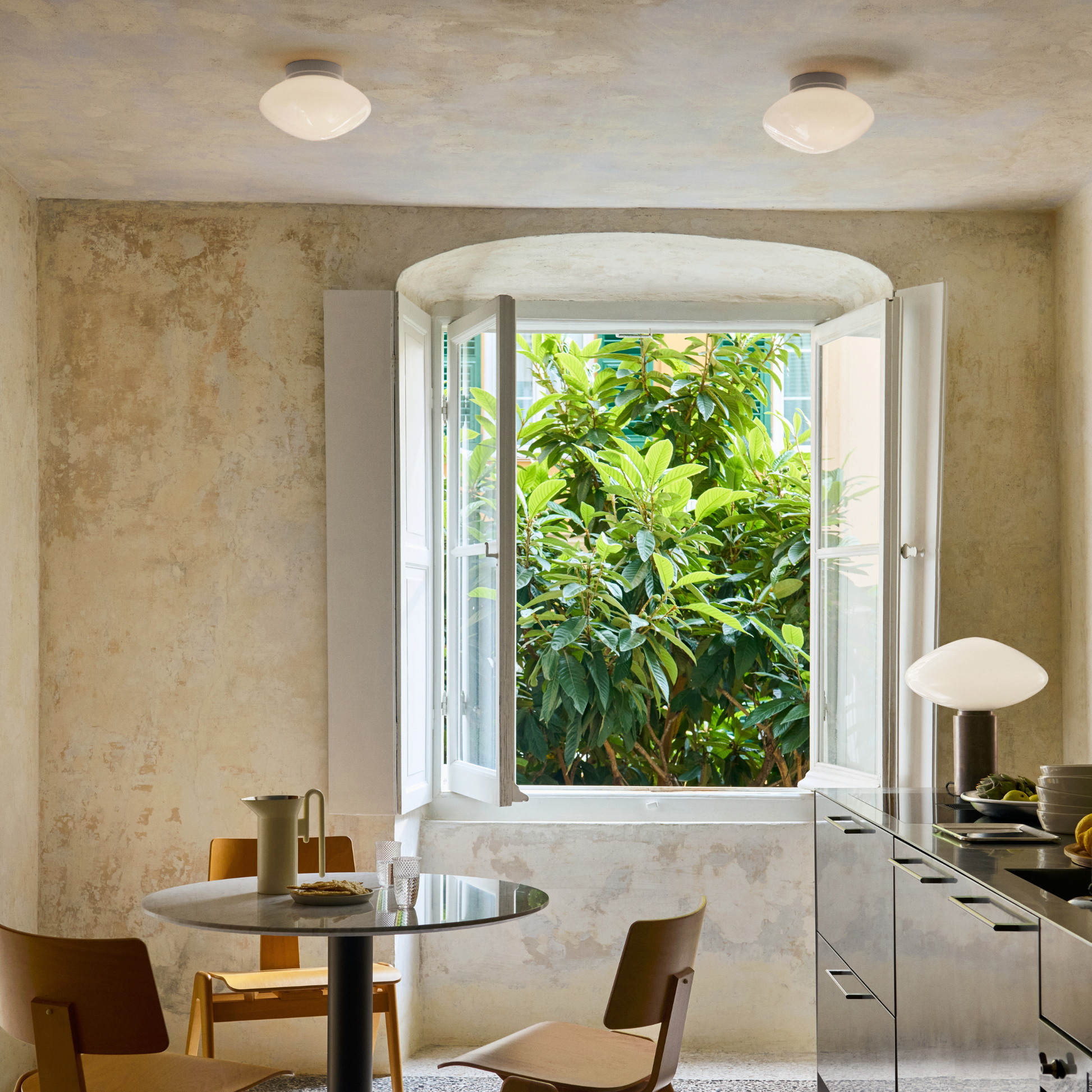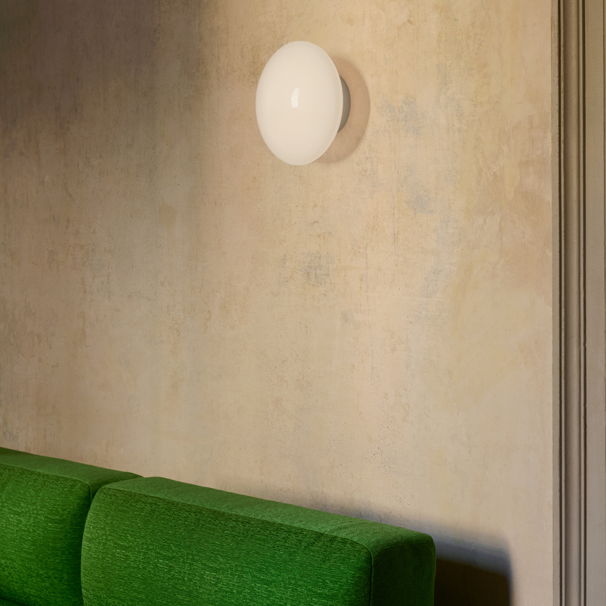 Die Mist AP22 von &Tradition, eignet sich perfekt als Wand- oder Deckenleuchte. Das Herzstück bildet ein handgefertigter, mundgeblasener Opalglas-Lampenschirm, der warmes, diffuses Licht spendet.
